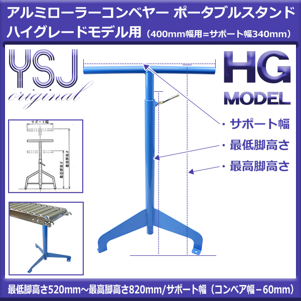 YSJ アルミローラーコンベヤー ハイグレードモデル用ポータブルスタンド【脚高さ520〜820mm】(400mm幅用=サポート幅340mm)【納期:20日程度で受注生産】
