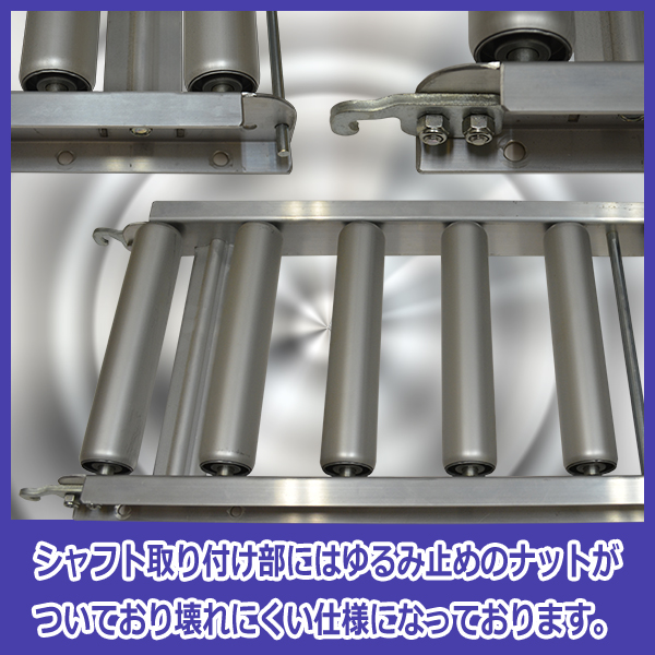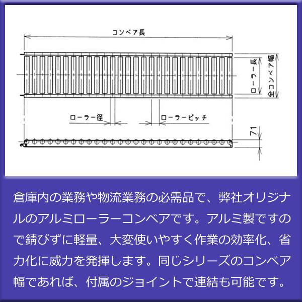 倉庫内の業務や物流業務の必需品で、弊社オリジナルのアルミローラーコンベアです。こちらはエコノミータイプです。シャフト部分に壊れにくい緩み止め用のロックナットを使用しており、またアルミ製ですので錆びずに軽量、大変使いやすく作業の効率化、省力化に威力を発揮します。同じシリーズのコンベア幅であれば、付属のジョイントで連結も可能です。
