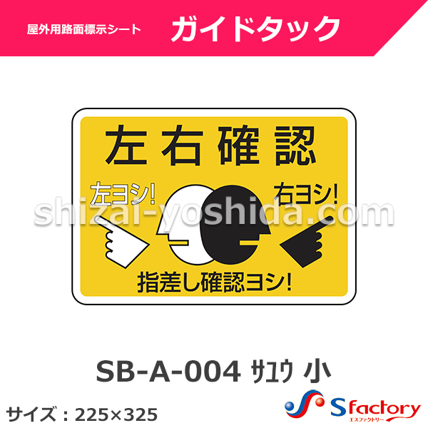 屋外用路面標示シート ガイドタック【SB-A-004 サユウ 小】サイズ:225mm×325mm(左右確認) JANコード: Array 販売価格: ¥12,768(税込) 在庫数 : 100 ポイント: 128pt (5倍キャンペーン中) 単位: 個 発送目安: 3~5日後 個
