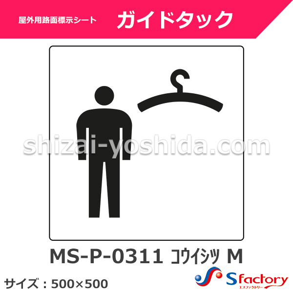 屋外用路面標示シート ガイドタック【MS-P-0311 コウイシツ M】サイズ:500mm×500mm(更衣室 マークのみ) JANコード: Array 販売価格: ¥27,820(税込) 在庫数 : 100 ポイント: 279pt (5倍キャンペーン中) 単位: 個 発送目安: 3~5日後 個